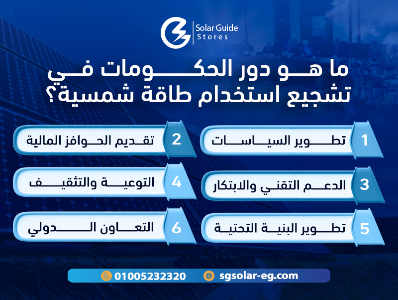 • تحفيز الاستثمارات، حيث يمكن للحكومات تقديم حوافز مالية، مثل: الإعفاءات الضريبية والقروض المدعومة، لتشجيع الأفراد والشركات على الاستثمار في الطاقة الشمسية.